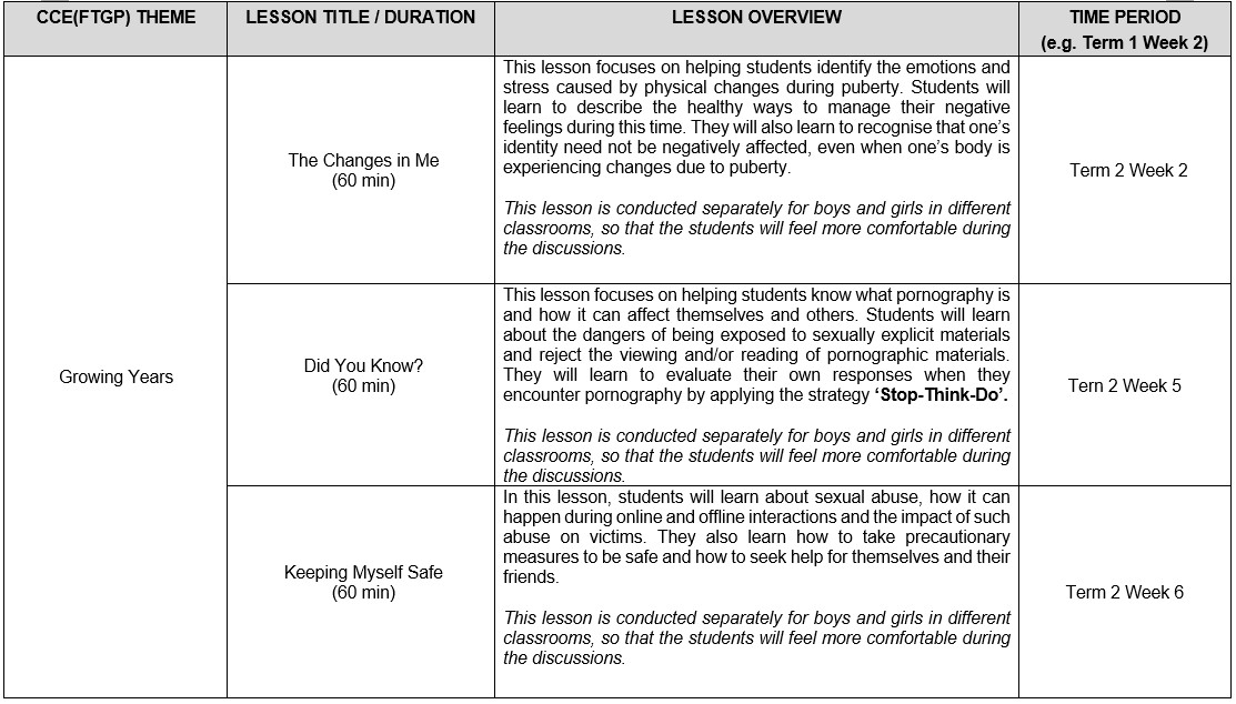 7. Sexuality Education (SEd) lessons are taught as part of CCE (FTGP) at Primary 5 and 6. Through these lessons, students will learn healthy ways to manage the physiological, social and emotional changes in their growing years. They learn to build healthy and rewarding relationships with others, including those with members of the opposite sex. Students are also guided to make wise, informed and responsible decisions to keep themselves safe from sexuality-related risks.